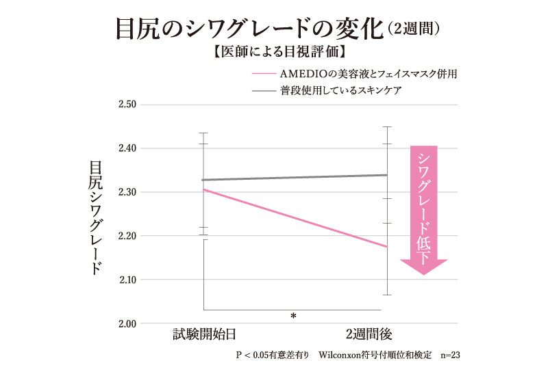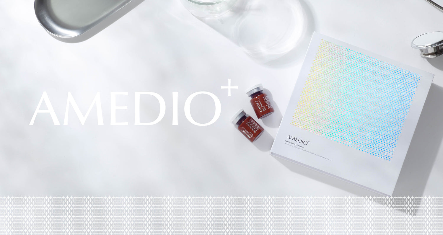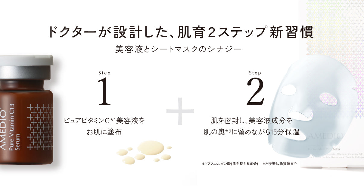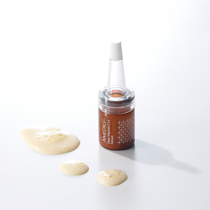 美容医療の現場で使われるビタミンCの濃度が平均9~10%なのに対し、AMEDIO+の美容液のピュアビタミンC*2の濃度は13%と濃密*1配合し、自宅ケアでも即効性*4を実感。