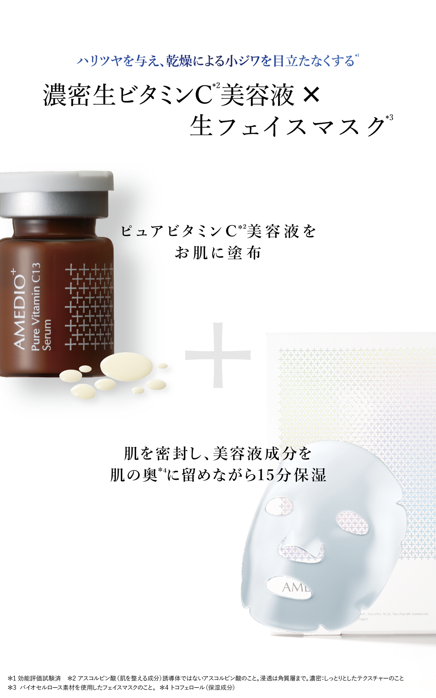 濃密生ビタミンC¹美容液と、第二の皮膚のような生フェイスマスク²の併用使いで、 ハリ・ツヤを与え、乾燥による小ジワを目立たなくします(効能評価試験済)。